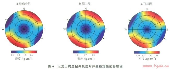 6)鉆井軌跡對井壁穩(wěn)定性的影響[9-10]:九龍山構(gòu)造不同方向的鉆井軌跡的井壁的穩(wěn)定性差異較大,如圖6所示:一般直井和定向井(井斜角少于45°)的坍塌壓力相對較低,井壁穩(wěn)定性相對較好;而水平井和大斜度井,平行最大水平主應(yīng)力方向,即為東東南(75°~165°)或西西北(255°~345°)方向的大斜度井(井斜大于45°),坍塌壓力相對較低,井壁穩(wěn)定性好,而垂直最大水平主應(yīng)力方向的水平井和大斜度井,坍塌壓力相對較高,鉆井風(fēng)險較高。