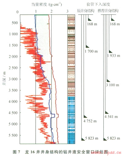 根據(jù)九龍山構(gòu)造地應(yīng)力模型和三個地層壓力剖面,對已鉆的龍16井和龍17井的井身結(jié)構(gòu)和鉆井液密度安全窗口進(jìn)行了風(fēng)險評估(圖7)。從維持井壁穩(wěn)定性角度考慮,分析其井身結(jié)構(gòu)和鉆井液密度安全窗口存在較大的缺陷,致使中間技術(shù)套管段無可操作的鉆井液密度安全窗口,井壁穩(wěn)定性變差,這可能是兩井在該段頻繁出現(xiàn)遇阻、卡鉆甚至鉆井事故的力學(xué)根源;同時海相地層的鉆井液密度安全窗口也非常窄,極易誘發(fā)井漏、井涌溢流復(fù)雜。