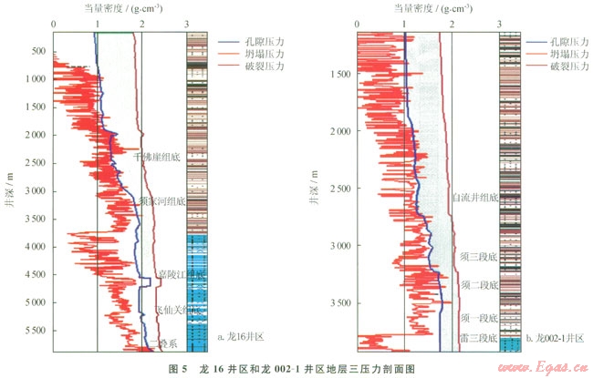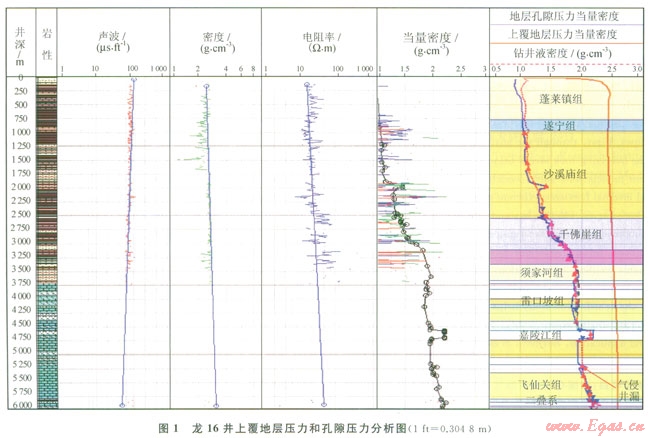 龍16井陸相地層的聲波、密度和電阻率3條曲線從中侏羅統(tǒng)沙溪廟組下部開始出現(xiàn)明顯偏離泥巖正常壓實趨勢[5](圖1)。因此判斷地層孔隙壓力白沙溪廟下部逐漸升高,部分井上三疊統(tǒng)須家河組的地層壓力系數(shù)高達(dá)l.83,本區(qū)實測壓力數(shù)據(jù)、鉆井液氣侵等現(xiàn)象也說明了須家河組具有較高的壓力異常。海相地層孔隙壓力形成機(jī)理和預(yù)測方法比較復(fù)雜,通過各井鉆井液密度、漏失和氣浸溢流等現(xiàn)象分析,認(rèn)為部分井段碳酸鹽地層壓力系數(shù)最高至2.15(如下三疊統(tǒng)嘉陵江組嘉二段高壓鹽水層)。