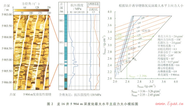 最大水平主應(yīng)力大小的定量確定比較困難,這是地應(yīng)力研究和應(yīng)用的一大難題。根據(jù)本區(qū)成像測井分析了各井在鉆井液液柱壓力下的井壁破壞類型及程度,利用地應(yīng)力分析模塊(GMI*SFIB),反演模擬小同深度處最大水平主應(yīng)力(SHmax)的大小。圖2顯示龍16井5904m深度處發(fā)育一條張裂縫,巖性為含膏灰?guī)r,巖石抗壓強(qiáng)度約l30MPa,上覆地層壓力當(dāng)量密度2.60g/cm3,最小水平主應(yīng)力當(dāng)量密度約2.30g/cm3,鉆井液密度(2.23~2.283/cm3)與孔隙壓力當(dāng)量密度之差為0.173/cm3,選取Mohr-Colum巖石破壞準(zhǔn)則,反演模擬其最大水平主應(yīng)力當(dāng)量密度為3.15~3.263/cm3。