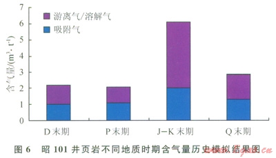 筆者以昭101井、l03等井為例開展了歷史模擬和流體包裹體分析,證實(shí)了斷裂對(duì)氣藏起強(qiáng)烈破壞這一判斷。昭通除靠近四川盆地的小部分區(qū)域外,多數(shù)鉆井都不成功,含氣量低(0.05~0.50m3/t)。昭通與蜀南相鄰,應(yīng)該大致經(jīng)歷了相似的演化歷程(圖5),含氣性差別大。昭101井位于芒部背斜,地表斷裂發(fā)育。目的層筇竹寺組因斷裂出現(xiàn)地層重復(fù),頁巖裂隙發(fā)育、方解石充填嚴(yán)重,含氣量的現(xiàn)場分析結(jié)果不足0.1m3/t,評(píng)價(jià)為極低含氣量,基本全部逸散。開展的昭101井熱演化歷史和含氣量歷史模擬研究表明:昭通地區(qū)J-K末期含氣量最大,如果穩(wěn)定抬升頁巖將出現(xiàn)超壓,含氣量應(yīng)該至少介于3~5m3/t,但是目前小于0.1m3/t(圖6)。