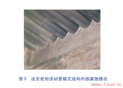 經(jīng)研究,認為采用非金屬材料的迷宮密封結構可以有效消除縫隙腐蝕的發(fā)生,迷宮密封活動管箱式結構見圖7。鍍搪瓷鋼管穿入迷宮密封套中(內(nèi)環(huán)面加工有迷宮鋸齒槽),迷宮鋸齒槽與鋼管外表面形成若干道迷宮腔,從而實現(xiàn)了密封。迷宮密封活動管箱式結構不但具有端面填料函密封的活動管箱式結構的優(yōu)點,還由于換熱管與箱體板之間有柔性迷宮密封套隔離,避免了在安裝、運行過程中對搪瓷層的破壞,從本質上消除了縫隙腐蝕的發(fā)生[5]。經(jīng)技術改造后的空氣預熱器,連續(xù)運行2年后運行狀況依然良好,箱體板及換熱管各部位基本上沒有發(fā)生腐蝕(見圖8、9)。