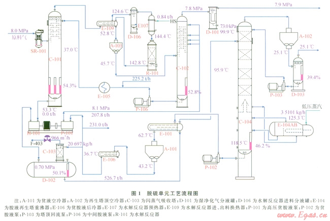 普光凈化廠引進美國Black&Veatch公司專利技術,以MDEA溶液作為吸收劑,采用兩級吸收、級間冷卻工藝選擇性吸收H2S,其工藝流程如圖l所示。經(jīng)過濾器(SR-l01)分離出的高含硫天然氣進入一級吸收塔(C-101),與MDEA溶液在吸收塔內(nèi)逆流接觸,在二級吸收塔(C-102)底部用泵抽出半富胺液,經(jīng)過中間冷卻器(E-105),然后返回一級主吸收塔頂部,一級主吸收塔底部富胺液經(jīng)液力透平(H-101)回收能量后,進入富胺液閃蒸罐(D-102),閃蒸后的胺液經(jīng)貧富胺液換熱器(E-101)換熱后進入再生塔(C-l04)再生,再生后的貧胺液循環(huán)使用[2-4]。閃蒸出的氣體經(jīng)閃蒸塔吸收H2S后分兩路,少部分進入尾氣焚燒爐伴燒,大部分放空至低壓火炬燒掉。