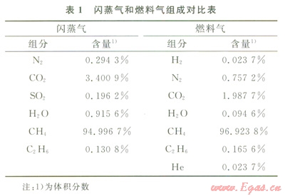 首先利用氣相色譜對閃蒸氣的組成進行了分析,結果如表l所示。從分析結果可以看出,其主要成分是CH4,含量為94.9967%(體積分數(shù)),通過表l的對比可以看出,閃蒸氣的組成和燃料氣的組成十分相近。