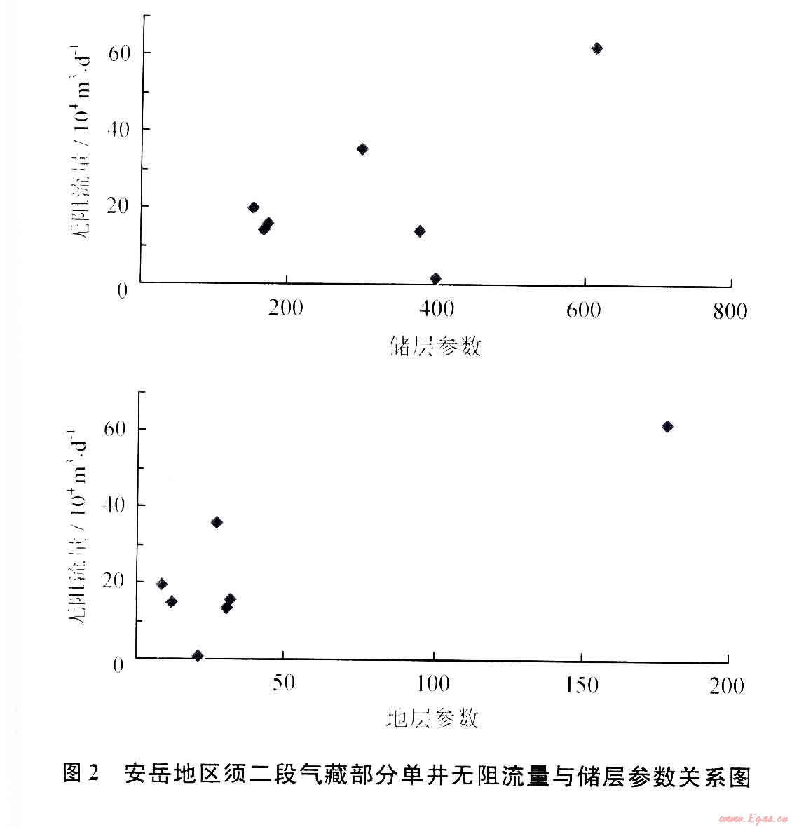 對儲層基礎(chǔ)參數(shù)較全的7口井,統(tǒng)計(jì)了安岳須二段氣藏(上亞段)計(jì)算的無阻流量與儲層參數(shù)相關(guān)性分析(圖2),儲層參數(shù)、地層系數(shù),無阻流量與它們間具有一定的正向相關(guān)件性不大.