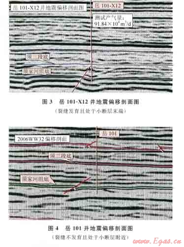 該區(qū)由于斷層規(guī)模較小,在二維地震解釋的須家河組底構(gòu)造圖中,部分小斷層未解釋,但在偏移剖面中可識別出。處于裂縫的可能發(fā)育區(qū),加砂壓裂后,也能獲得高產(chǎn)。比如岳l01、岳111井,可能是與小斷層附近發(fā)育的裂縫有了溝通,氣井獲得了高產(chǎn)氣流(圖4)。