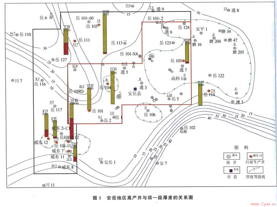 對安岳地區(qū)測試完成井統(tǒng)計(jì)表明:中、高產(chǎn)井中共有10口,其中有5口位于雷口坡組殘丘發(fā)育區(qū)(岳101-Xl2、岳l05井、威東l2、威東7、岳l04側(cè)),有3口井位于雷口坡組相對高帶、須一段缺失區(qū)邊緣(岳101-11、岳l01、岳ll4),即雷口坡組殘丘發(fā)育區(qū)及其附近集中了目前所獲氣產(chǎn)量80%的中、高產(chǎn)井。