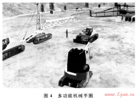 通過仿真平臺模擬展示了滅火搶險作業(yè)的核心設(shè)備——多功能機械手隅7。,充分展現(xiàn)了罩引火筒、挖掘清障、剪切清障、破碎井場水泥基礎(chǔ),運送遠距離水力噴砂切割頭、吊裝單件井口裝置等功能(圖4)。