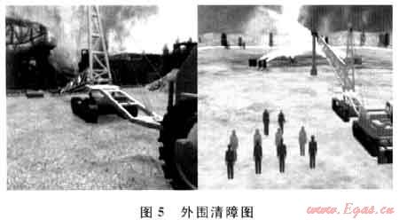 通過仿真平臺模擬井噴失控后帶火作業(yè)的帶火清障及井口清障過程[5~7],模擬搶險隊員進行切割、拖拉作業(yè),直到徹底清除井架底座,采用引火筒將散狀火焰集中引導(dǎo)垂直向上,完成滅火前井口周圍的徹底清障,使井口完全暴露,如圖5所示。