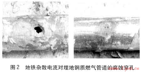 香港曾因地鐵雜散電流引起煤氣管道腐蝕穿孔,造成煤氣泄漏事故;北京、天津地鐵雜散電流已造成隧道內(nèi)水管腐蝕穿孔;據(jù)東北輸油管理局統(tǒng)計(jì),東北地區(qū)共有長(zhǎng)輸油管道約2000km,其中80%的腐蝕穿孔事故來(lái)自雜散電流的影響[4]。地鐵雜散電流對(duì)埋地鋼質(zhì)燃?xì)夤艿赖母g穿孔見(jiàn)圖2,地鐵雜散電流對(duì)金屬管道的強(qiáng)烈腐蝕作用可見(jiàn)一斑。
