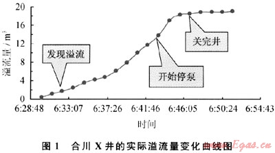合川Y井:在半夜O0:35,溢流量由0.6m3增至3.4m3,準(zhǔn)備采取關(guān)井措施,直到00:39,關(guān)井才完成,期間耗費(fèi)時(shí)間4min,溢流量由3.4m3增加到16.2m3,此時(shí),循環(huán)排氣處理過程中,套壓上漲至16.9MPa,溢流變化情況如圖2所示。