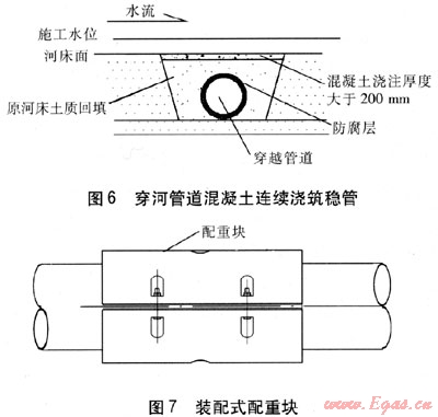 管道往往不可避免地要穿跨越城鎮(zhèn)道路、高速公路、國(guó)道(省道)、鐵路(見(jiàn)圖5)及江河或其他特殊設(shè)施。對(duì)于穿跨越管道,由于管道運(yùn)行后難以再實(shí)施檢修工作或檢修工作難度大、費(fèi)用高,因此管道穿跨越施工及措施的好壞直接影響著管道穿跨越的質(zhì)量。穿跨越河流段的管道(見(jiàn)圖6),當(dāng)河床受水流沖刷而使其覆土厚度逐漸減小,將可能造成管道懸空。對(duì)于通航河道,如果進(jìn)行疏浚或船舶拋錨時(shí),將對(duì)管道構(gòu)成危害。如果管道配重(見(jiàn)圖7)不足,將會(huì)造成管道的上浮而破壞。因此,應(yīng)特別注意穿越深度及穿越層的穩(wěn)定,同時(shí)應(yīng)修建適當(dāng)?shù)臉?biāo)志物、護(hù)岸、護(hù)底、配重塊等保護(hù)設(shè)施,使管道免于破壞。