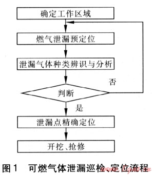 日常的巡檢可采用車載或便攜檢測設(shè)備確定工作區(qū)域,如發(fā)現(xiàn)泄漏還需對泄漏氣體進(jìn)行種類辨識,排除其他氣體(如沼氣)的干擾。對已經(jīng)確定泄漏的管段可先實施對泄漏點的預(yù)定位,由在線檢測或日常巡檢確定泄漏的大致區(qū)域,再進(jìn)行精確定位,如遇硬質(zhì)路面或在大片區(qū)域內(nèi)均檢測到高濃度可燃?xì)怏w,需結(jié)合路面鉆孔機(jī)和吸真空系統(tǒng)打孔定位??扇?xì)怏w泄漏巡檢、定位流程見圖1。