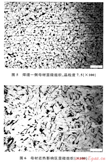 顯微組織及夾雜物分析結(jié)果表明:管線母材顯微組織為鐵素體+珠光體,有少量帶狀組織,且晶粒度為7.5級(jí)(圖5);熱影響區(qū)組織為鐵素體+珠光體,晶粒度分布極不均勻,范圍為5.5~9.5級(jí)(圖6);焊縫熔池組織為鐵素體+少量珠光體+少量魏氏組織,晶粒度為8.5級(jí)(圖7、8)。綜合評(píng)定該管線焊縫熔合情況為完全熔合。