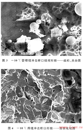 母材拉伸試樣宏觀斷口特征由纖維區(qū)、剪切唇及放射區(qū)3部分組成,屬于韌性斷裂,未發(fā)現(xiàn)明顯的原始缺陷(圖1);焊縫拉伸試樣其中兩件斷在母材,一件斷在焊縫處。從宏觀上看,都是韌性斷口,具有韌窩形貌特征,存在氣孔、未焊透等缺陷;母材室溫沖擊試樣斷口屬韌性斷口,在-10℃下沖擊試樣斷口纖維區(qū)較少,以脆斷為主;焊縫沖擊試樣宏觀上觀察斷口由晶狀區(qū)、纖維區(qū)及剪切唇3部分組成,大部分為晶狀區(qū),纖維區(qū)較少,以脆斷為主,屬于韌-脆性混合型斷口,存在氣孔、未焊透缺陷,如圖2所示;-10℃下沖擊試樣斷口纖維區(qū)較少,具有解理、準(zhǔn)解理形貌以及泥狀花樣特征,以脆斷為主,存在氣孔、未焊透等缺陷(圖3、4)。