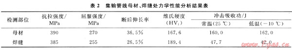 在四川某集輸管線上截取試樣分別按照國(guó)家標(biāo)準(zhǔn)進(jìn)行理化性能試驗(yàn),管線母材和焊縫的化學(xué)成分、力學(xué)性能綜合測(cè)試結(jié)果見表1、2。