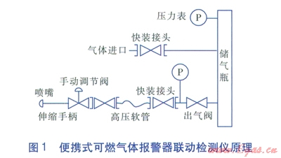 便攜式可燃氣體報警器聯(lián)動檢測儀是一種用于檢測可燃氣體報警器工作狀態(tài)的裝置,它可以用指定濃度的可燃氣體(以下簡稱標準氣體)對報警器進行檢測,這樣既能夠測試報警器的工作狀態(tài)是否正常,同時還不對傳感器等靈敏部件造成損壞,其原理見圖l。