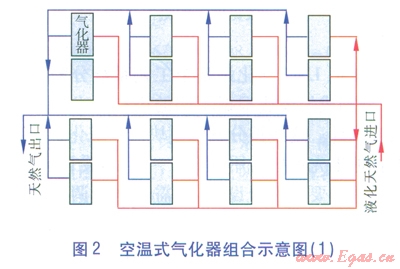 空溫式氣化器的臺數(shù)和氣化量,可跟據(jù)工程建設規(guī)模和用戶的要求綜合確定??諟厥綒饣鹘M合示意見圖2、3。