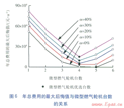 在上述5種工況的優(yōu)化配置方案中,各種設(shè)備的優(yōu)化容量與負(fù)荷不確定度的具體關(guān)系見(jiàn)圖4,其中,溴化鋰機(jī)組和熱泵機(jī)組僅給出了額定制冷量。由圖4可以看出,隨著負(fù)荷不確定度a的增加,地下水地源熱泵機(jī)組的額定制冷量因考慮極限工況而逐漸增大,而微型燃?xì)廨啓C(jī)發(fā)電機(jī)組和煙氣型溴化鋰機(jī)組的容量在考慮負(fù)荷不確定性后反而有所減小。這是因?yàn)轸敯魞?yōu)化配置避免了在負(fù)荷需求偏小時(shí)出現(xiàn)由于所有設(shè)備容量均增大而引起的年總費(fèi)用后悔值增大的情況,從而降低了系統(tǒng)的優(yōu)化配置方案在實(shí)際運(yùn)行時(shí)的經(jīng)濟(jì)風(fēng)險(xiǎn),使其更具經(jīng)濟(jì)魯棒性。