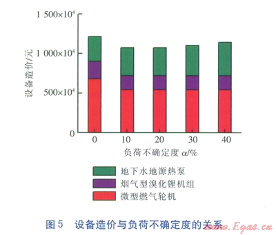 5種工況下相應(yīng)優(yōu)化配置方案的設(shè)備造價(jià)情況見(jiàn)圖5。可以看出,發(fā)電機(jī)組的造價(jià)在系統(tǒng)初投資中占較大比例;由于分布式能源系統(tǒng)的優(yōu)化配置在考慮負(fù)荷不確定性后,發(fā)電機(jī)組的臺(tái)數(shù)由5臺(tái)減為4臺(tái),因此,系統(tǒng)的初投資相對(duì)于傳統(tǒng)的不考慮負(fù)荷不確定性的優(yōu)化配置方案而言有所減少;隨著負(fù)荷不確定度的增加,地下水地源熱泵機(jī)組的造價(jià)因考慮極限工況而增加,使得總的初投資逐漸增加。