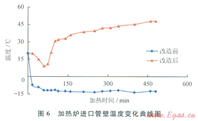 分析上述圖表數(shù)據(jù)可以得出:①改造后加熱時(shí)間減少了27.3%,再生氣用量減少了18.4%,加熱爐電耗量減少了28.6%;②由于再生氣余熱是一個(gè)自身循環(huán)預(yù)熱的過(guò)程,大約lh之后,換熱爐才開(kāi)始對(duì)再生氣預(yù)熱,隨后加熱爐進(jìn)口溫度緩慢升高,最后管壁溫度穩(wěn)定在47℃左右;③再生氣余熱利用存在滯后,隨著換熱器逐漸換熱,加熱爐單位時(shí)間電耗量相比改造前電耗減小,充分說(shuō)明再生氣余熱得到利用,達(dá)到了節(jié)能運(yùn)行的目的。