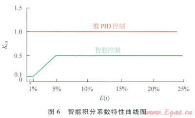 可見,采用智能控制,可使偏差快速穩(wěn)定收斂,當(dāng)[å|e(t)|/n]/Yset≥5%時(shí),采用固定比例控制,當(dāng)[å|e(t)|/n]/Yset≤5%時(shí),采用一定時(shí)間(大約0.5個波動周期)相對偏差絕對值的均值(10/Yset)[ å|e(t)|/n]作為改變控制量的隨機(jī)變動系數(shù),智能系數(shù)Kint,與E(t)在5%以下時(shí)呈線性遞增關(guān)系,控制量u(t)與E(t)呈非線性遞增關(guān)系。