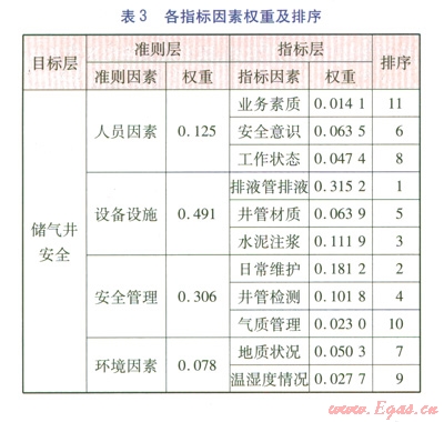 匯總各準(zhǔn)則層因素與指標(biāo)層因素對于儲氣井安全目標(biāo)的權(quán)重,即可以排出各指標(biāo)因素對儲氣井安全權(quán)重的順序。以某CNG地下儲氣井為例,利用層次分析法,把相關(guān)各指標(biāo)因素進行綜合評定,并且進行歸一化處理,見表3。