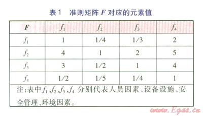 此處利用方根法計算,用兩兩比較求出各元素的相對重要程度,其準(zhǔn)則矩陣F對應(yīng)的元素值見表1。