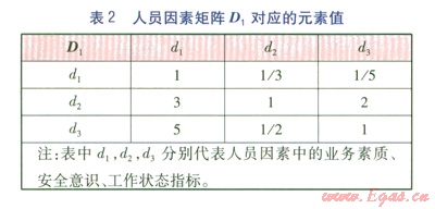 利用方根法計算,可以得出指標(biāo)層對準(zhǔn)則層各因素的權(quán)重,人員因素矩陣D1對應(yīng)的元素值見表2。