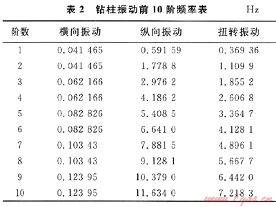 文中對(duì)鉆柱的振動(dòng)模態(tài)分析擴(kuò)展到20階模態(tài),但是根據(jù)大量研究試驗(yàn)可知,10階模態(tài)就足以表明鉆柱的振動(dòng)情況。表2列出了鉆柱橫向、縱向、扭轉(zhuǎn)振動(dòng)的前10階頻率。