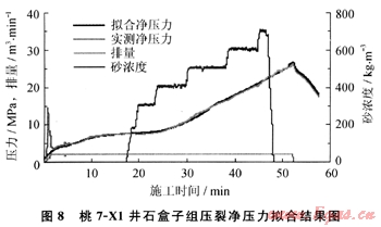 在待壓裂水平井壓裂參數(shù)設(shè)計(jì)前,先采用 FracproPT10.7軟件對(duì)鄰井已施工的同層位井壓裂曲線進(jìn)行精確凈壓力擬合,以桃7-X1井壓裂施工曲線擬合為例,擬合結(jié)果如圖8所示,獲取區(qū)域地應(yīng)力參數(shù)和巖石力學(xué)參數(shù):泊松比為0.22,彈性模量為1.2×104MPa,產(chǎn)層閉合壓力梯度為0.0126MPa/m,產(chǎn)層閉合壓力為41.4MPa,泥巖閉合壓力為46.92MPa,產(chǎn)、隔層應(yīng)力差為5.5MPa,區(qū)域破裂壓力梯度為0.018MPa/m,區(qū)域地層破裂壓力為59.0MPa。