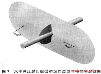 2) 裸眼水平井由于應(yīng)力集中使得縱向裂縫的破裂壓力比橫向裂縫的破裂壓力低,壓裂首先形成縱向微裂縫,在穿過應(yīng)力集中帶之后形成橫向主裂縫。