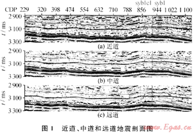 對(duì)3個(gè)數(shù)據(jù)體進(jìn)行頻譜分析,近道頻率范圍在4.32~80.37Hz之間,中道在4.32~64.24Hz之間,遠(yuǎn)道在4.77~60.77Hz之間,也就是說(shuō)近道的剖面分辨率最高,中道次之,遠(yuǎn)道分辨率最低。在圖1中,可以看出近道剖面顯示出的細(xì)節(jié)性要比遠(yuǎn)道剖面清晰得多,中道好于遠(yuǎn)道而差于近道。