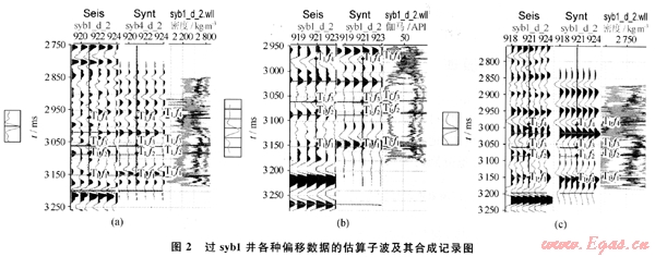 對(duì)于近道、中道和遠(yuǎn)道數(shù)據(jù)體分別提取了子波,經(jīng)過(guò)多次子波估算,最后得到了比較理想的子波以及由估算的子波制作的合成記錄。圖2-a是過(guò)syb1井的近道數(shù)據(jù)的估算子波及其合成記錄,圖2-b是過(guò)syb1井的中道數(shù)據(jù)的估算子波及其合成記錄,圖2-c是過(guò) syb1井的遠(yuǎn)道數(shù)據(jù)的估算子波及其合成記錄。