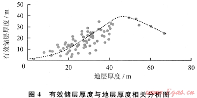川東石炭系有效儲層厚度與地層厚度有一定的相關(guān)性。在地層厚度小于45m時,有效儲層的厚度與地層厚度多成正相關(guān)關(guān)系;而在地層厚度大于45m時,地層厚度與有效儲層的關(guān)系相反(圖4)。由此可知,石炭系厚度小于10m的地區(qū),儲層多小于5m;地層厚度小于5m的地區(qū),多為致密層,可以成為巖性圈閉與地層圈閉的側(cè)向封堵層。