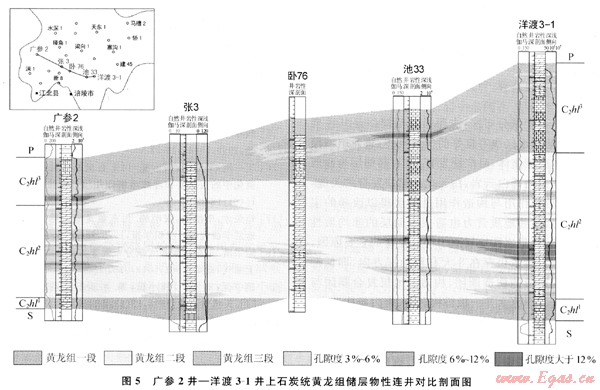 石炭系儲層具有較強的非均質(zhì)性與不連續(xù)性特征。其白云巖儲層的厚度及物性變化很快(圖5),雖然石炭系都發(fā)育儲層,但儲層發(fā)育的層位并不相同,有的呈現(xiàn)不連續(xù)特征。石炭系黃龍組單個白云巖儲層厚度多在1~5m,個別疊合后可達10m厚,這顯示石炭系存在廣泛發(fā)育局限小型巖性圈閉的可能性。