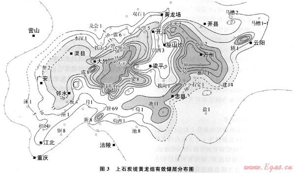 川東石炭系儲層分布廣泛,有效儲層多在黃龍組地層厚度大于10m的石炭系分布區(qū)[17~18]。有利的白云巖儲層(孔隙度大于3%)主要發(fā)育于開江古隆起的兩側(cè)地區(qū),厚度可達40m(圖3);在石炭系發(fā)育較薄的西南、東南與東北部地區(qū),白云巖儲層多小于10m;在西北部龍會達州地區(qū),石炭系的地層厚度雖然較厚,但是主要發(fā)育石灰?guī)r,儲層基本不發(fā)育。