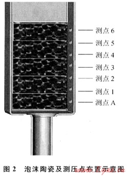 圖2為泡沫陶瓷及壓力測定點(diǎn)布置示意圖。用軟質(zhì)材料包裹泡沫陶瓷,放置在鋼管中,保證泡沫陶瓷周邊與鋼管內(nèi)表面的密封;在鋼管側(cè)面開有7個測壓孔,其間距為10mm。實(shí)驗(yàn)中對測點(diǎn)A與其他6個測點(diǎn)的壓力差用數(shù)字微壓差計進(jìn)行8次測量,取平均值;空截面風(fēng)速由畢托管在實(shí)驗(yàn)段出口處的不同位置也進(jìn)行8次測量,取其平均值。實(shí)驗(yàn)所采用的泡沫陶瓷規(guī)格為50mm×50mm×20mm,PPI分別為10、20、30,空隙率為88%。