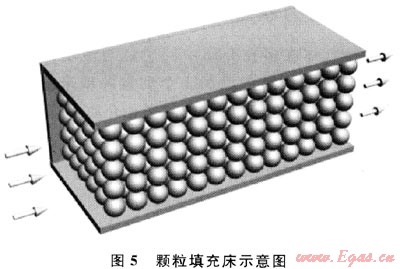 氣流在多孔介質(zhì)中的流動阻力主要是由流體質(zhì)點(diǎn)間存在相互牽制作用、流體與多孔介質(zhì)的表面摩擦造成的。圖5為顆粒填充床示意圖。對于氣流在顆粒填充床與泡沫陶瓷中的流動,若兩者的比表面積及空隙率相等,可認(rèn)為兩者的流動阻力是近似相等的。