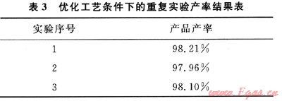 為了驗(yàn)證正交實(shí)驗(yàn)優(yōu)化出來的工藝條件的可靠性,在該條件下又進(jìn)行了3次重復(fù)實(shí)驗(yàn),得到的產(chǎn)率結(jié)果如表3所示。
