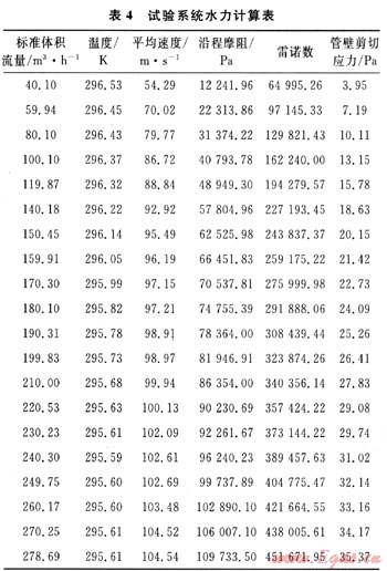 在進(jìn)行減阻劑測試之前,首先要進(jìn)行空白管道的水力分析。空氣由壓縮機(jī)壓縮到0.8MPa后進(jìn)入測試管道,保證壓縮機(jī)出口壓力pi不變,標(biāo)準(zhǔn)體積流量Qg調(diào)節(jié)范圍為40~280m3/h,經(jīng)測量、計(jì)算得到一組數(shù)據(jù)如表4所示。