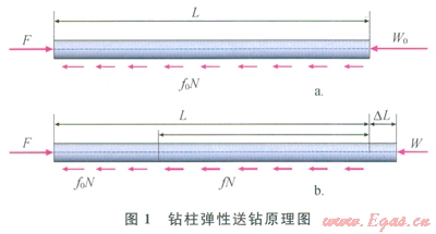 對于沒有加液力推進(jìn)器或水力振蕩器的帶有井下動(dòng)力的鉆具組合,在送到井底并加上鉆壓后,地面就暫停送鉆。此時(shí),從地面看,鉆桿已經(jīng)停止運(yùn)動(dòng),那么鉆頭是否也已經(jīng)停止鉆進(jìn)?顯然不是,那么是什么在推動(dòng)鉆頭前進(jìn)?答案是鉆柱的彈性。鉆柱彈性送鉆原理如圖l所示。