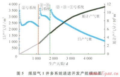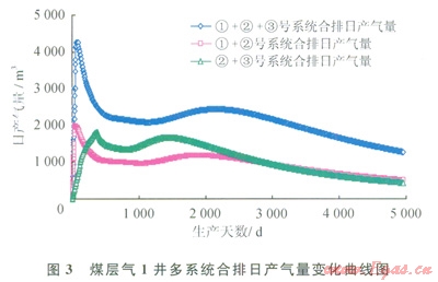 ①號系統(tǒng)和②號系統(tǒng)合排,最高產(chǎn)氣量約為2000m3/d,平均產(chǎn)氣量為950m3/d左右,1000m3/d產(chǎn)量可持續(xù)2800d左右(圖3),15a累計(jì)產(chǎn)量為4.68×106m3;②號系統(tǒng)和③號系統(tǒng)合排,最高產(chǎn)氣量也在2000m3/d左右,平均產(chǎn)氣量為1100m3/d左右,1500m3/d日產(chǎn)量持續(xù)2000d左右,15a累計(jì)產(chǎn)量為5.39×106m3;①、②、③這3個(gè)系統(tǒng)合排,最高產(chǎn)氣量達(dá)到4300m3/d,平均產(chǎn)氣量為2100m3/d左右,2000m3/d產(chǎn)量可持續(xù)3300d左右,l5a累計(jì)產(chǎn)量為10.45×106m3。實(shí)際排采時(shí)由于各系統(tǒng)壓力不同,系統(tǒng)間相互干擾,并非所有含氣系統(tǒng)都有產(chǎn)能貢獻(xiàn)。