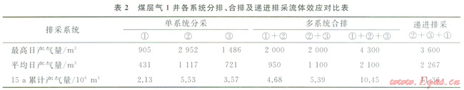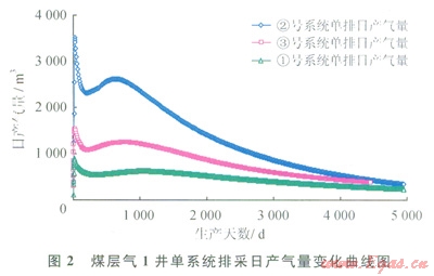 單獨(dú)排采①號系統(tǒng),產(chǎn)氣量介于306~905m3/d,平均為431m3/d(圖2),15a排采的累計(jì)產(chǎn)氣量為2.13×106m3(表2);單獨(dú)排采②號系統(tǒng),產(chǎn)氣量介于502~2952m3/d,平均為lll7m3/d,15a排采的累計(jì)產(chǎn)氣量為5.53×106m3;單獨(dú)排采③號系統(tǒng),產(chǎn)氣量介于413~l486m3/d,平均為721m3/d。15a排采的累計(jì)產(chǎn)氣量為3.57×106m3。