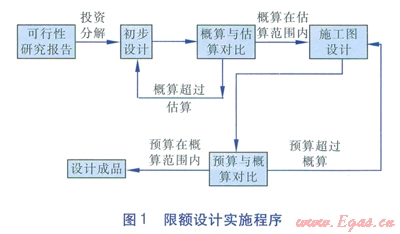 限額設(shè)計是按照批準(zhǔn)的可行性研究報告和投資估算控制初步設(shè)計,按照批準(zhǔn)的初步設(shè)計總概算控制施工圖設(shè)計,保證總概算不被突破。限額設(shè)計實(shí)施程序見圖1。