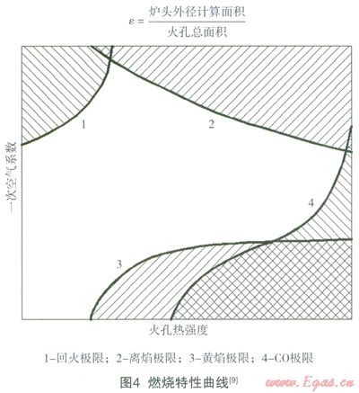 對(duì)于大氣式燃燒器,其典型燃燒特性曲線如圖4所示。,當(dāng)氣源氣質(zhì)發(fā)生變化時(shí),燃燒器設(shè)計(jì)火孔熱強(qiáng)度過大,極易出現(xiàn)CO排放問題;而設(shè)計(jì)一次空氣系數(shù)過大且火孔熱強(qiáng)度過小,燃燒器容易發(fā)?;鼗?,火孔熱強(qiáng)度設(shè)計(jì)過大則易導(dǎo)致離焰;對(duì)于一次空氣系數(shù)過小的燃燃燒器爐頭,選擇合適的設(shè)計(jì)工況點(diǎn)(一次空氣系數(shù)和火孔熱強(qiáng)度),將直接影響燃燒器應(yīng)對(duì)氣源氣質(zhì)變化的適應(yīng)能力。另一方面,火孔尺寸過大、火孔間距過小、爐頭外徑偏小,易使得火孔分布緊密、火焰變軟連焰,從而導(dǎo)致CO排放增加、熱效率降低;反之則火孔過于分散、火焰較硬、傳熱效果變差,熱效率不理想,某些情況同樣會(huì)導(dǎo)致燃燒不完全,出現(xiàn)污染物排放問題[10]。就此,根據(jù)上面爐頭設(shè)計(jì)參數(shù)統(tǒng)計(jì)結(jié)果,本文定義一無因次參數(shù)e來綜合捕述民用灶具爐頭火孔大小、間距、個(gè)數(shù)同爐頭大小的關(guān)系,從而評(píng)價(jià)爐頭設(shè)計(jì)情況: