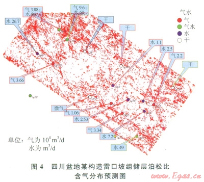 預(yù)測(cè)得到的含氣分布如圖4所示,紅色為含氣。該區(qū)4口純產(chǎn)氣井,3口井位于或緊鄰低泊松比部位(紅色),1口井位于不含氣部位,5口純產(chǎn)水井均位于不含氣的部位,3口氣水同產(chǎn)井都位于或靠近含氣部位,4口干井有2口井位于不含氣部位。總體看,l6口井3口井不符合(符合率為81%)。