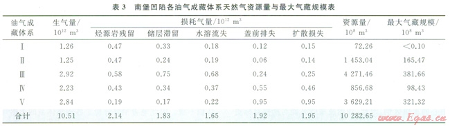 近年來在南堡凹陷占近系砂巖獲得了一些高產(chǎn)油氣流,天然氣的勘探值得重視,但對天然氣的資源最還認識不清。因此筆者主要評價了符成藏體系的天然氣資源量。依據(jù)天然氣成藏過程中,不同損耗烴量的計算模型3[7,25-31],結(jié)合研究區(qū)的地質(zhì)條件,獲得了研究區(qū)的烴源巖殘留氣量、儲層滯留氣量、水溶流失氣量以及蓋前排失氣量,并由此計算了南堡凹陷各油氣成藏體系的天然氣資源囂(表3)。從天然氣資源量的對比情況看,南堡Ⅲ、Ⅴ號成藏體系的天然氣資源量最大,南堡Ⅱ號成藏體系的天然氣資源量次之,南堡Ⅰ、Ⅳ號成藏體系的天然氣資源懿相對較小,總天然氣資源量超過10000×108m3。本次估算的各成藏體系石油和天然氣的資源量與徐安娜[32]預(yù)測的南堡凹陷油氣分布情況基本一致。因此,南堡凹陷天然氣藏具有重要的勘探潛力。