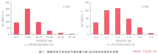 對428個構(gòu)造油氣藏排烴距離的統(tǒng)計表明(圖3-a),油氣藏主要分布在橫向排烴距離為0~15km范圍,其中5~l0km范圍內(nèi)最多,達201個。當(dāng)橫向排烴距離超過10km,油氣藏的個數(shù)隨排烴距離的增加旱減小的趨勢。這是由于在地質(zhì)條件下,隨烴源巖排烴距離的增加,烴源巖排出的烴類更容易遭受各種形式的殘留及損耗,導(dǎo)致運移至儲層的烴類逐漸較少,由此削弱了烴源巖的供烴效率。另外,統(tǒng)計規(guī)律還表明,縱向排烴距離亦和油氣藏個數(shù)具有類似的規(guī)律(圖3-b),油氣藏主要集巾在小于4km的范圍。