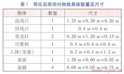 房間的物理模型見圖1,房間的長×寬×高為3.40m×2.90m×2.95m。房間圍護結(jié)構(gòu)視為絕熱,送風裝置安裝于側(cè)墻上部,送風口高度為2.2m?;仫L口位置見圖l,尺寸為0.4m×0.4m。模型房間內(nèi)有2盞熒光燈,電功率均為36W。人體、計算機等熱源靠近回風口一側(cè)的墻邊,人體和計算機的發(fā)熱量分別為l00W/人、300W/臺。將房間內(nèi)的人體、計算機、桌子等分別簡化成規(guī)格不同的立方體,簡化后房間內(nèi)物體具體數(shù)量及尺寸見表1。